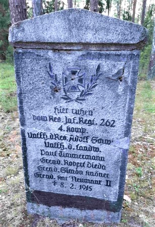 Kriegsgräber für Gefallene des Ersten Weltkriegs auf dem ehemaligen Friedhof des verschwundenen Ortes: Grabdenkmal für fünf deutsche Gefallene und Grabstein für vier unbekannte russische Soldaten.