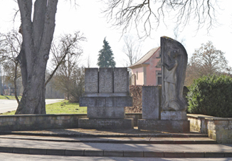 Steinfigur mit einer Gedenktafel (Vermisste 2. Weltkrieg) auf einem Sockel. Daneben ein Steinaltar mit drei darauf aufgestellten Gedenkplatten.
