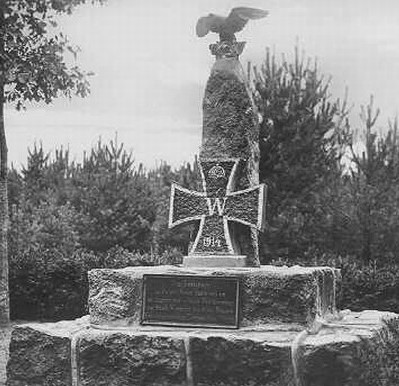 Ehemaliger Stein zum Gedenken an die Beschießung von Wormditt im August 1914 nördlich der Stadt: Zweistufiger Natursteinsockel mit aufgerichteter Granitstele, angebrachtem EK-Zeichen und krönendem Adler (heute umgewidmet).