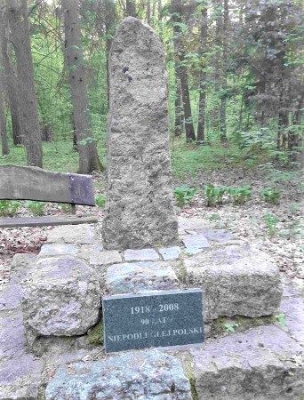 Nach 1945 wurde in Ostpreußen die deutsche Bevölkerung vertrieben und die meisten Denkmäler abgerissen, beschädigt oder umgewidmet. Hier wurden alle Teile entfernt, die an die ursprüngliche Bedeutung erinnern. Daraus wurde ein Stein zum Gedenken an den 90. Jahrestag der Gründung Polens gemacht. Auf der Rückseite wurde eine Erklärungstafel zur Geschichte des Denkmals in Polnisch angebracht. Von einem Foto im Internet von Bruchstücken der Original-Tafel konnten Teile der Widmung abgeschrieben werden.