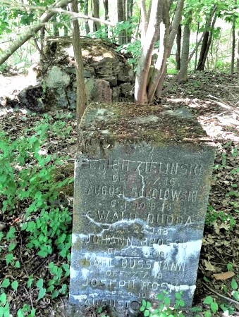Nach 1945 wurde in Ostpreußen die deutsche Bevölkerung vertrieben und die meisten Denkmäler abgerissen, beschädigt oder umgewidmet. Hier wurde das ganze Denkmal zerstört, der Quader vom Sockel gestoßen und alles verwildern lassen. Die Inschriften haben die Zeit aber gut überdauert. Leider sind keine historischen Aufnahmen des Denkmals auffindbar und werden gesucht. Ein großer quadratischer Steinblock neben dem Sockel war wahrscheinlich der Deckstein, der auf dem Quader aufgesetzt wurde.