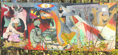Auf dem Bild im Hintergrund ist das Grauen der Kriege dargestellt.