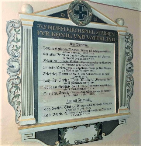 Auf dem Denkmal des Krieges 1813-1815 sind keine Namen verzeichnet. Sie sind auf einer Gedenktafel in der Kirche notiert. Aus dem Kirchenbuch konnten viele zusätzliche Daten aufgelistet werden. Der hier 2005 zu den alten Gedenktafeln oft abgelesene Ortsname „Alt Priesack“ war falsch (einen solchen Ort gibt es nicht), es ist der Nachbarort Alt Friesack und wurde dementsprechend geändert.