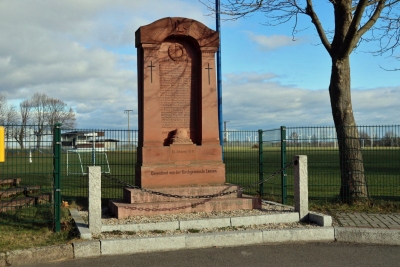 Denkmal an der Hauptstraße vor dem Sportplatz für die Orte Leesen (durch Braunkohleabbau devastiert), Zechau, Altpoderschau und Neupoderschau.