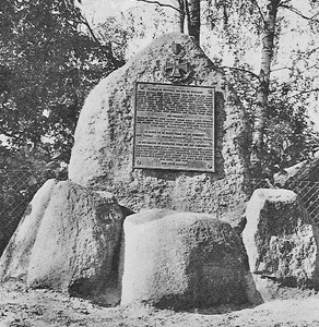 Denkmal für die Gefallenen des Ersten Weltkriegs: Ring aus mittelgroßen Findlingen, darin ein sehr großer Findling mit Widmungs- und Namenstafel und EK-Ziechen im oberen Bereich (abgerissen).