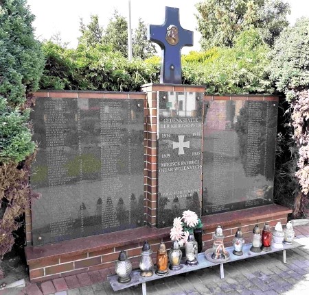 Das alte Denkmal für die Gefallenen des 1. Weltkriegs wurde nach 1945 abgerissen. Nach der politischen Wende in Polen wurde dieses neue Denkmal errichtet und die Namen der Kriegsopfer des 1. und 2. Weltkriegs darauf zusammen notiert.