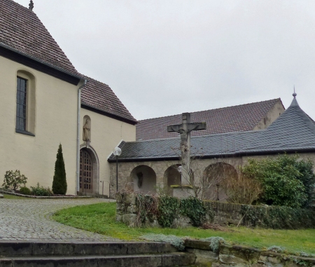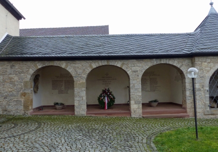 An der Kirche steht seitlich ein kleiner Wandelgang mit dem Kriegerdenkmal an der Wand, bestehend aus einer gemalten Heiligenfigur und