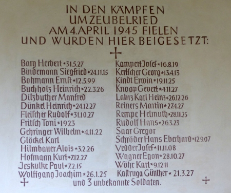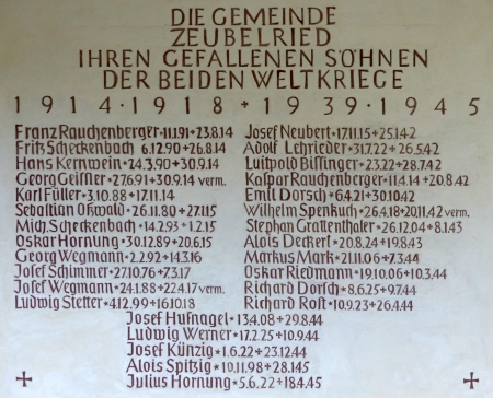 den Namen der Gefallenen beider Weltkriege, sowie den bei den Ortskämpfen 1945 Gefallenen.