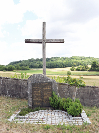 Dahinter ein Holzkreuz. Standort ist auf dem Friedhof an der evangelischen Kirche.