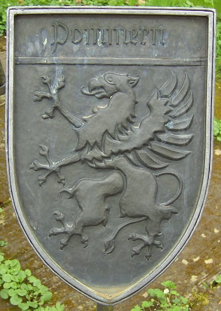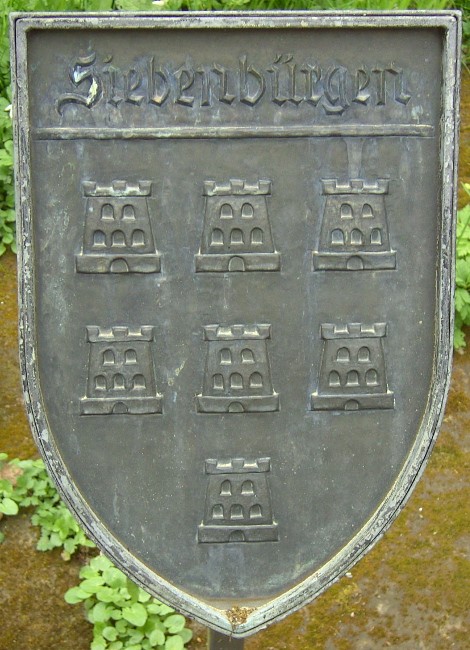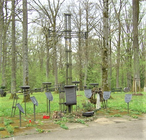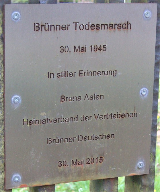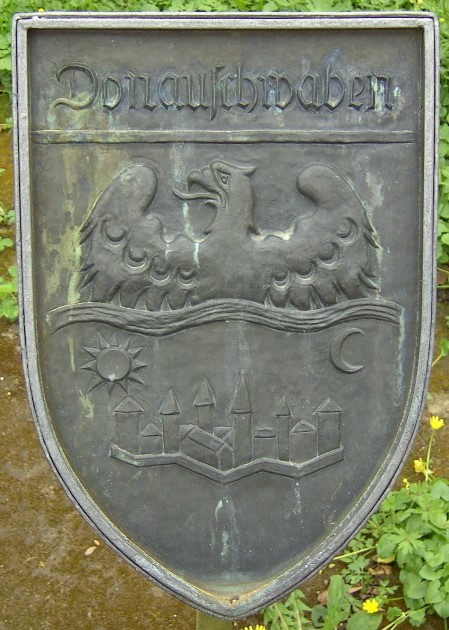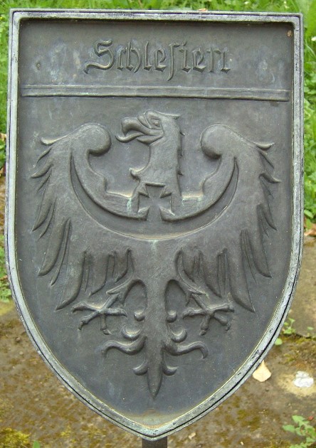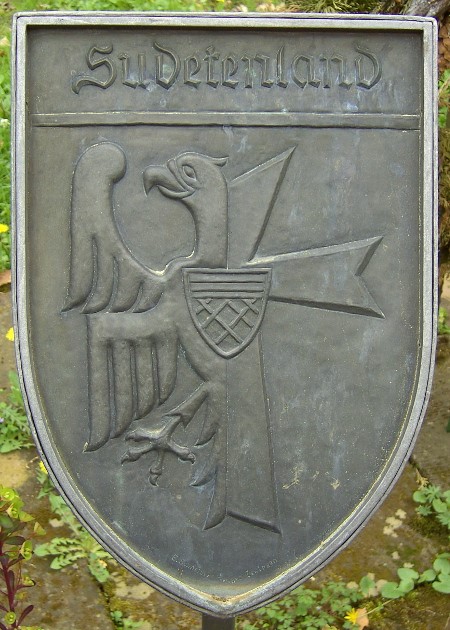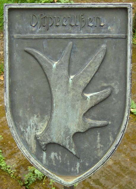 Denkmal aus Metall auf dem Waldfriedhof. Oben eine Inschrift der Heimat, seitlich je zwei Tellerauflagen, vorne je drei Wappen der ehemaligen Ostgebieten.