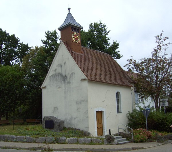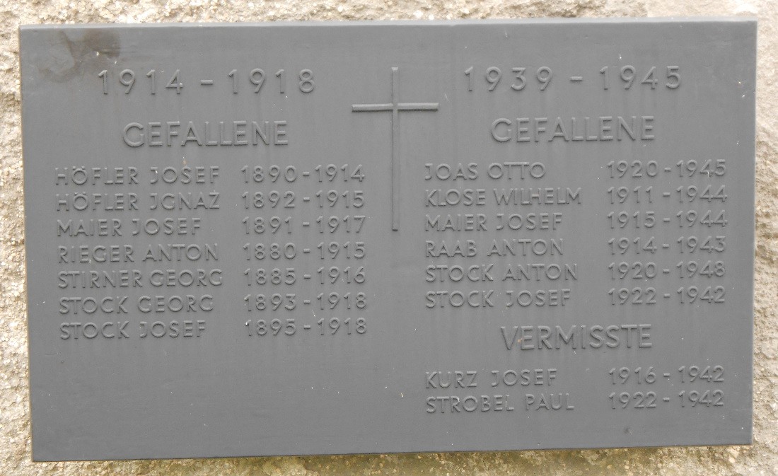Felsstein mit einer Tafel der Gefallen und Vermissten beider Weltkriege vor der Kapelle Zur Heiligsten Dreifaltigkeit.