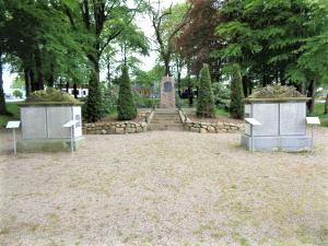 Erster Weltkrieg: Am Fuße des kleinen Hügels zwei rechteckige Blöcke, Vorderseite mit je zwei Tafeln, die die Namen der einundsiebzig Kriegstoten des Ersten Weltkrieges nennen. An den Schmalseiten der Blöcke sind Inschriften.