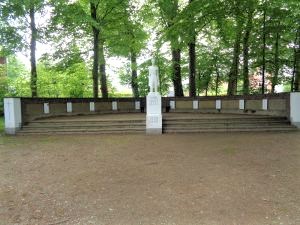 Zweiter Weltkrieg: Für die Kriegstoten des Zweiten Weltkrieges eine niedrige Mauer im Halbbogen, darin zehn Tafeln mit zweihundertvierundfünfzig Namen. Zentral im Halbbogen die Plastik eines knienden Jünglings, im Sockel eine Inschrift.