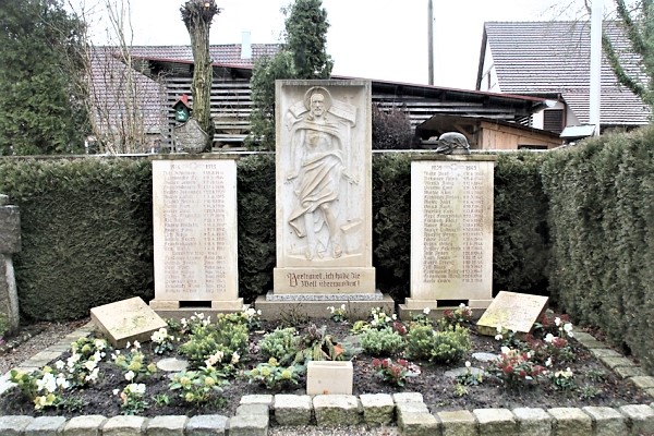 Denkmal im Friedhof: Drei stehende Marmortafeln, daneben zwei Zusatztafen am Boden und ein Kriegsgrab.