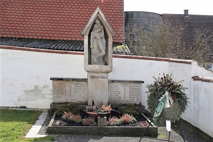 Steinsockel, darauf eine Sterbezene unter einem Dach. Am Sockel sind zwei kleine Wände angebracht, an denen die Namen aufgeführt sind.