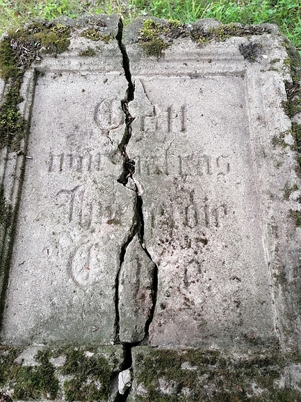 Abgestufter Obelisk mit krönendem Adler, umgeben von einem Metallzaun. Der Obelisk wurde in den 1960er Jahren abgerissen und die Fragmente bei der Ruine der Kirche platziert.
