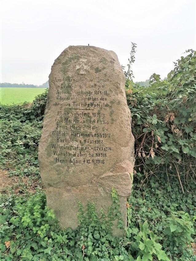 Im Ostteil des kleinen Friedhofs ein Findling als Kriegerdenkmal für acht Gefallene des Ersten Weltkriegs.