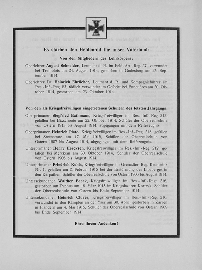 Genannt werden Gefallenen der Schule. Es werden Namen der weiteren Kriegsteilnehmer der Schule genannt.