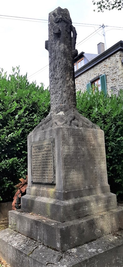 Das Denkmal besteht aus einem ca. 90 cm starken Sandsteinwürfel, welcher auf zwei Stufen ruht. Obenauf ein abgebrochener, naturalistisch gestalteter Baumstamm, gleichfalls aus Sandstein. Die Daten (Namen sowie Todes- bzw. Vermisstendatum) des Ersten Weltkrieges wurden vorne in den Stein graviert (Positiv). Links und rechts, auf Metalltafeln die Daten des Zweiten Weltkrieges. Rückseite zeigt einen deutschen Stahlhelm (Erster Weltkrieg) mit Lorbeerkranz. Auf der mittleren Stufe des Denkmals wurde die Abwandlung eines Goethe-Zitats (Gedicht „Epilog zu Schillers Glocke“) in den Stein graviert (teils kaum noch zu entziffern).