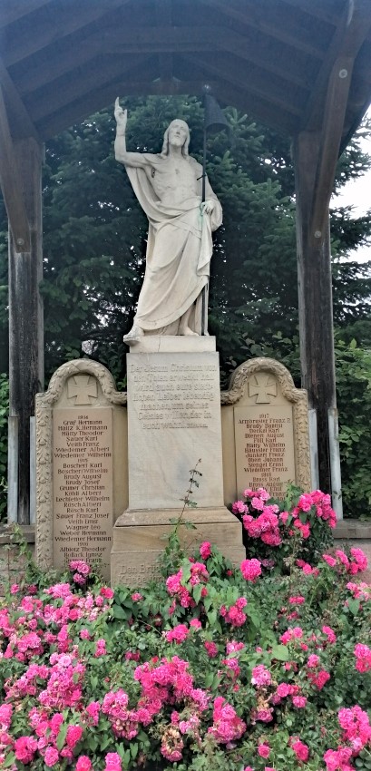 Denkmal auf dem Friedhof mit Heiligen-Figur auf einem Sockel, links und rechts davon Tafeln mit den Namen der Gefallenen.