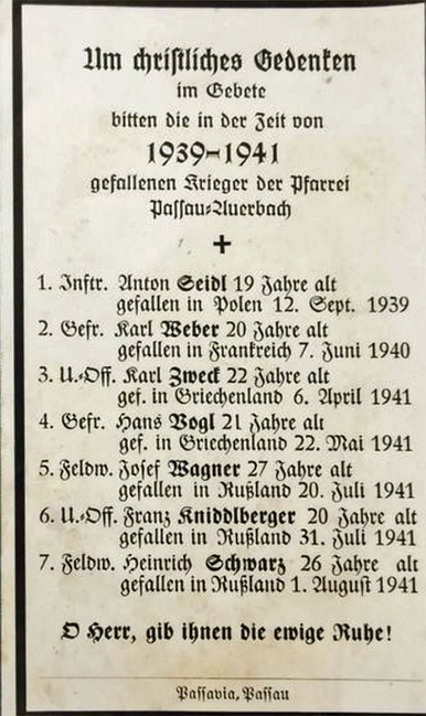 Gebetskarte für sieben Gefallene aus Auerbach von 1939 - 1941.