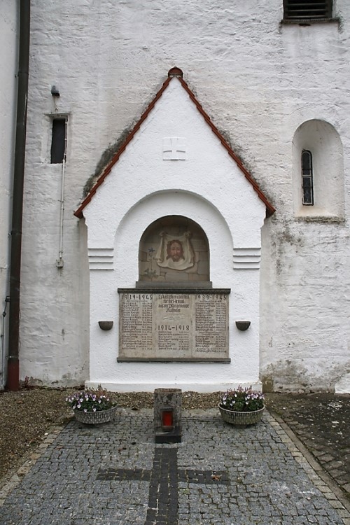 Überdachter Anbau an der Kirche, im Zentrum Christusbild, darunter Namenstafel, sowie Daten von privaten Gedenksteinen.