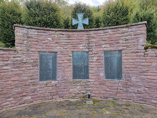 Halbrunde Mauer aus bearbeiteten Sandsteinen. Oben ein Deutsches Kreuz, in der Wand sind drei Gedenktafeln eingefügt.