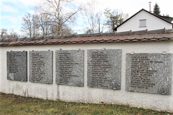 Fünf Tafeln an der Friedhofsmauer (Namen vermutlich vom Zweiten Weltkrieg).