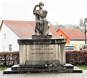 Als Platz für das Denkmal wurde der alte Friedhof ausgewählt. Auf einem breiten Grundsockel, der mit Inschriften versehen ist, erhebt sich ein Skulptur. Der Sockel wurde von dem Bildhauermeister Heidelmann von Bad Sulza aus Freyburger Muschelkalk gearbeitet. Auf ihm wurde vom Bildhauer Heise aus Weimar die Figur eines sitzenden Kriegers errichtet. Die Figur besteht aus bayerischem Muschelkalk. Sie verkörpert die deutsche Kraft. Der Krieger schaut in die Zukunft und mahnt, Hoffnung und Erinnerung zu bewahren, was Deutschland im Kriege geleistet hat. Die Vorderseite enthält die Widmung, während die Namen der Opfer an den Seiten und der Rückseite des Kubus angebracht sind. Die jetzige Widmung ist nicht die originale. Die Weihe fand am 11. Oktober 1925 statt.
