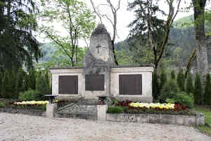 Steinplastik „gefallener Soldat“, oben Stahlhelm, Gedenktafeln.