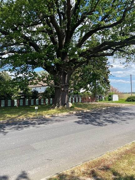 Friedenseiche. Die B 101 an der Abfahrt Bahnsdorf verlassend befindet sich der Stein an der Eiche am Ortseingang.