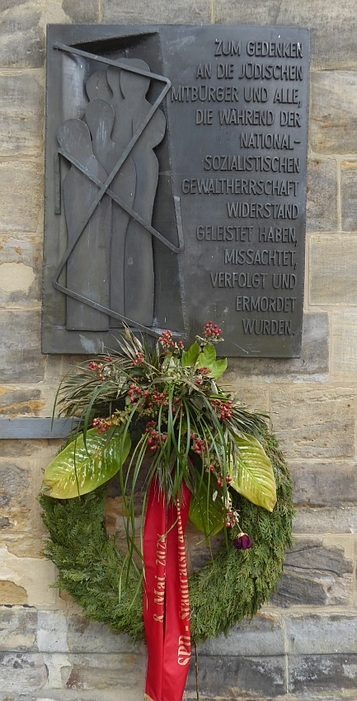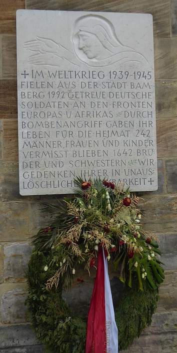 Drei Gedenktafeln für den 2. Weltkrieg an der Oberen Brücke in der Altstadt.