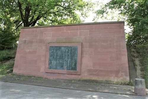 Denkmal außen an der dreieckigen Schanze: Gemauerte, U-förmige Wand mit Kupfertafel.