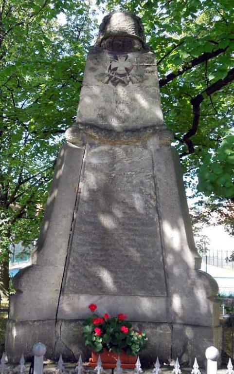 Den oberen Abschluss bildet ein Stahlhelm mit Eichenlaub, darunter ist ein Tatzenkreuz.
