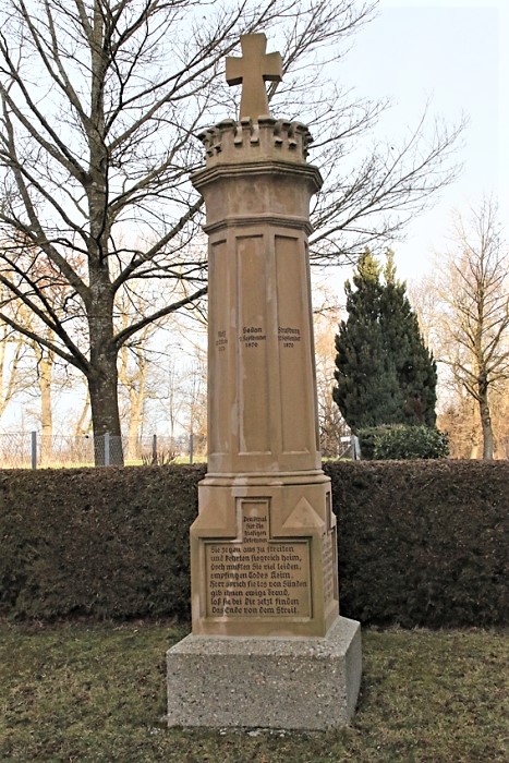 Bei der Kirche: Säule, unten viereckig, darüber achteckig und oben ein Kreuz
