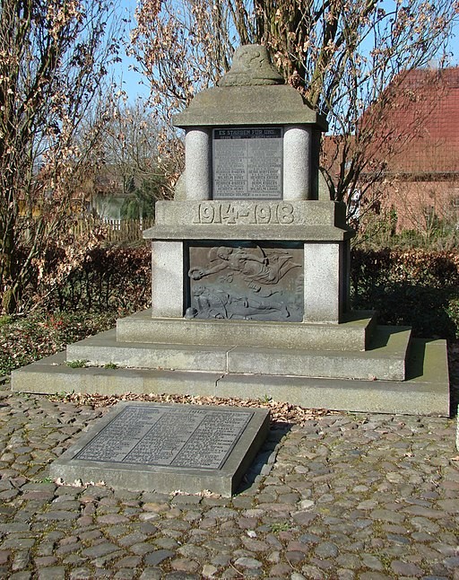 Im oberen Teil befindet sich eine Tafel mit den Namen aus dem Ersten Weltkrieg, im unteren Teil das Relief mit einem sterbenden Soldaten,