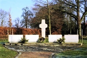 Großes Kreuz, links und rechts davon je zwei Sandsteintafeln mit den Namen der Gefallenen der beiden Weltkriege.