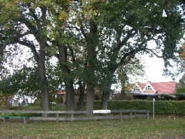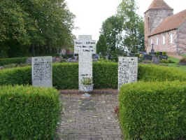 Dreiteiliges Denkmal vor der Kirche von Bedekaspel. Auf dem Weg zur Kirche befindet sich noch eine eingezäunte Baumgruppe,