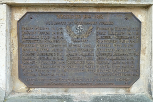 Mehrstufiges Sandsteinmonument, darin eingelassen eine gusseiserne Platte für die Kriegstoten 1914-1918 mit Inschrift.