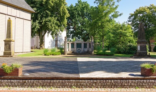 Auf einer Grünanlage am Friedensplatz bei der Kirche befinden sich drei Denkmäler.
