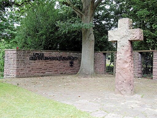 Gedenkstätte zu Ehren der Gefallenen des Zweiten Weltkrieges in Bergen: Großes Steinkreuz, Inschrift an der Mauer.