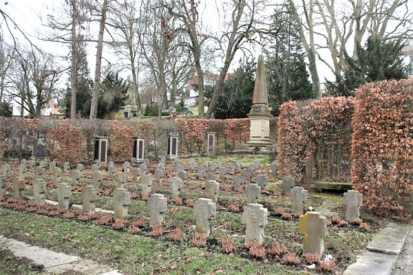 Erster und Zweiter Weltkrieg: Im Vordergrund sechs Reihen mit Kreuzsteinen (einige Namen nicht mehr lesbar).