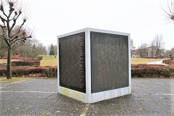Stadtfriedhof: Am Platz vor der Aussegnungshalle ein großer Würfel mit Namen,