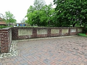 Kriegsopfer der Kriege 1870 bis 1945 auf Namenstafeln an einer Ziegelsteinmauer am Friedhof.