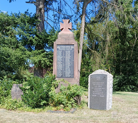 Rechts davor ein Gedenkstein für den 2. Weltkrieg.
