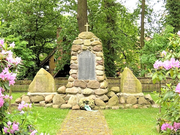 Aus Feldsteinen gemauertes Denkmal (Ecke Ziegeleiweg / Flackenhorster Weg), das auf einer Tafel die Namen der im Ersten Weltkrieg Gefallenen enthält,