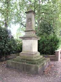 Teil einer Denkmalanlage vor dem Haupteingang zum Friedhof in Bockhorn. Auf einem mehrstufigen Postament aus Sandstein steht ein Obelisk mit Andreaskreuz bekrönt.