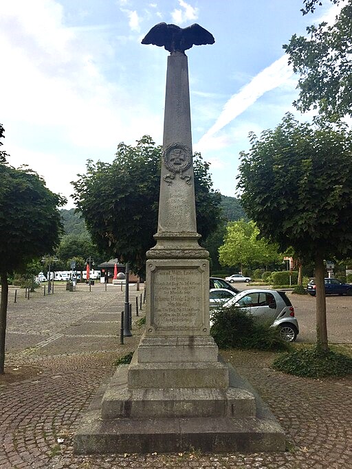 Denkmalssäule mit Inschrift und Namen der Kriegsopfer. Obenauf sitzt der Reichsadler mit ausgebreiteten Schwingen.