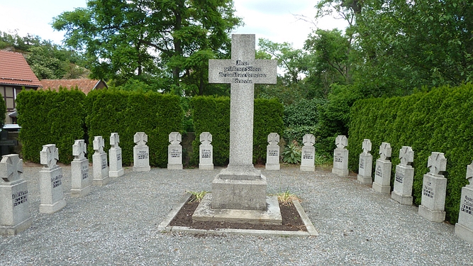 Etliche Gedenksteine für die Toten der beiden Weltkriege auf dem Friedhof, um ein großes Steinkreuz herum angeordnet.