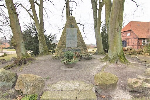Auf dem Kirchplatz eine aus Feldsteinen errichtete Pyramide für die Gefallenen beider Weltkriege mit einem Kreuz auf der Spitze.